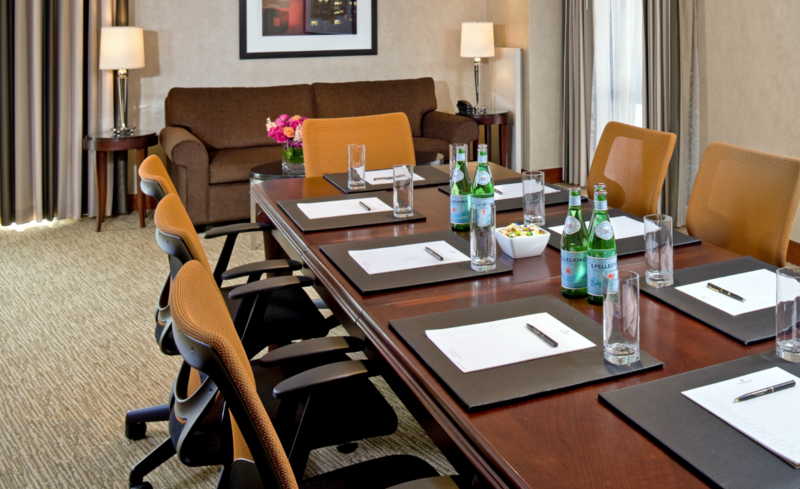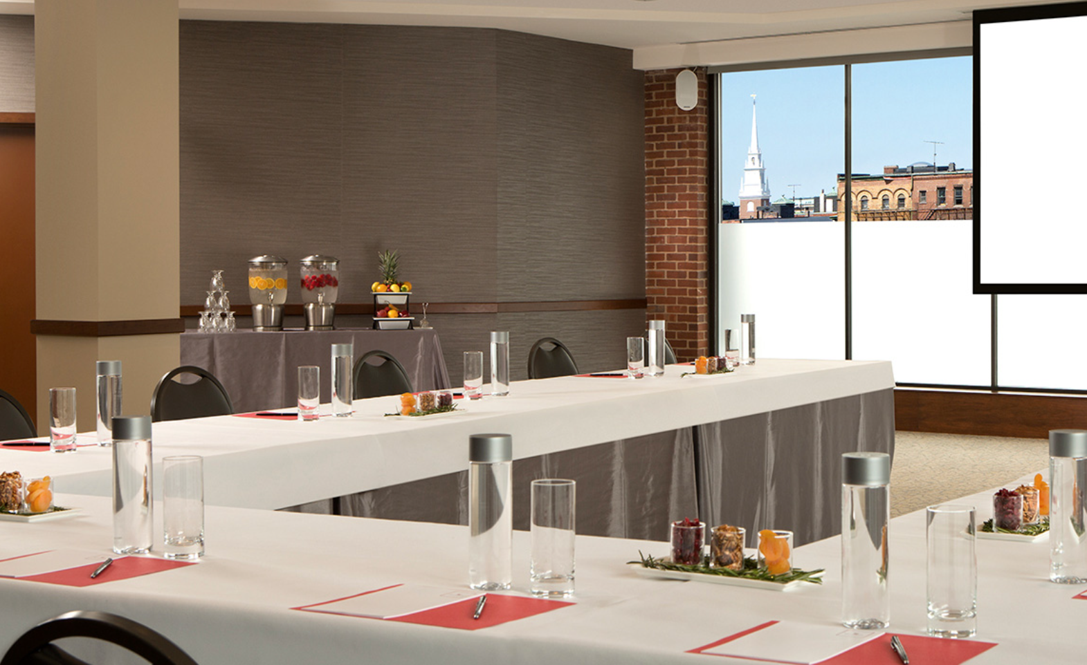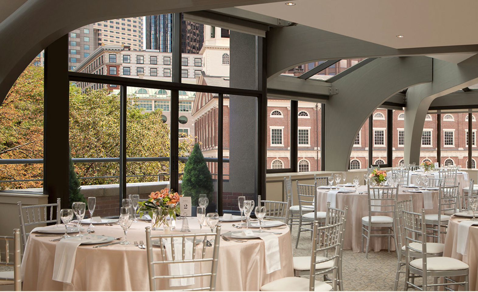 This spectacular space is bathed in natural light thanks to floor-to-ceiling bay windows, a glass ceiling, and three walk-out balconies overlooking Faneuil Hall. A private 750-square-foot foyer for exhibits, receptions, or buffets adds a magnificent compliment.